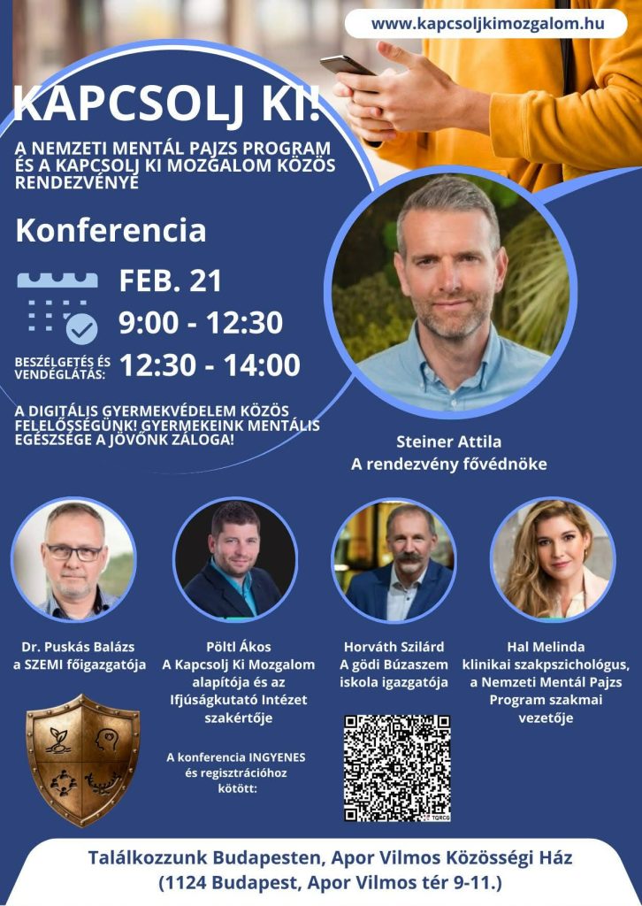 E gondolat jegyében szeretettel hívjuk meg Önöket a „Kapcsolj Ki! – A Nemzeti Mentál Pajzs Program és a Kapcsolj Ki Mozgalom közös konferenciájára”, amely a digitális gyermekvédelem és a fiatalok mentális egészségének aktuális kérdéseit állítja a középpontba.